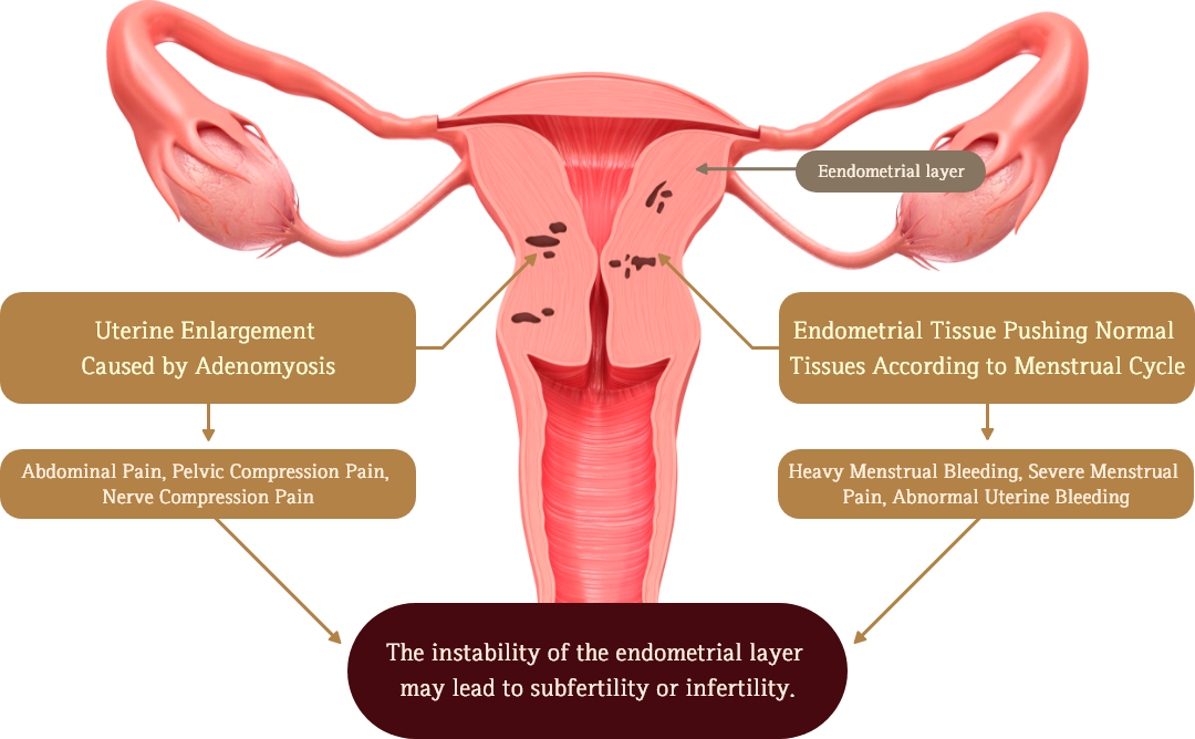 Adenomyosis happens when endometrial tissue invades the myometrium. This causes the abnormal thickening of uterine muscle.